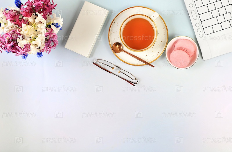 Современный женский стол, домашний офис. Компьютер, цветы гиацинта и чашка чая, круассаны на элегантном столе, концепция образа жизни, удобная работа на дому, шаблон для дизайна, плоская планировка,