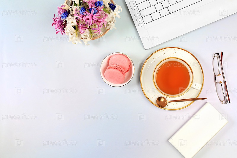 Современный женский стол, домашний офис. Компьютер, цветы гиацинта и чашка чая, миндальное печенье на элегантном столе, концепция образа жизни, удобная работа на дому, шаблон для дизайна, плоская планировка