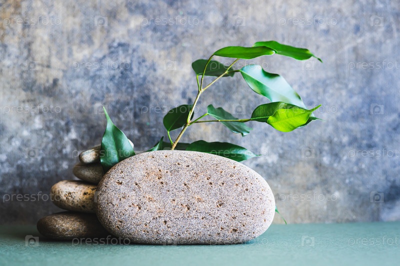 Органический природный фон из ветвей с листьями и камнями на зеленом
