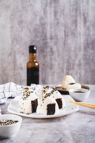 Традиционная японская еда Онигири из риса и тунца на тарелке на столе, вертикальный вид