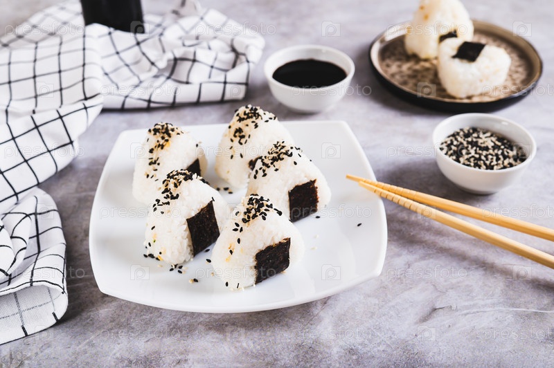 Домашние рисовые шарики онигири с тунцом и нори на тарелке на столе