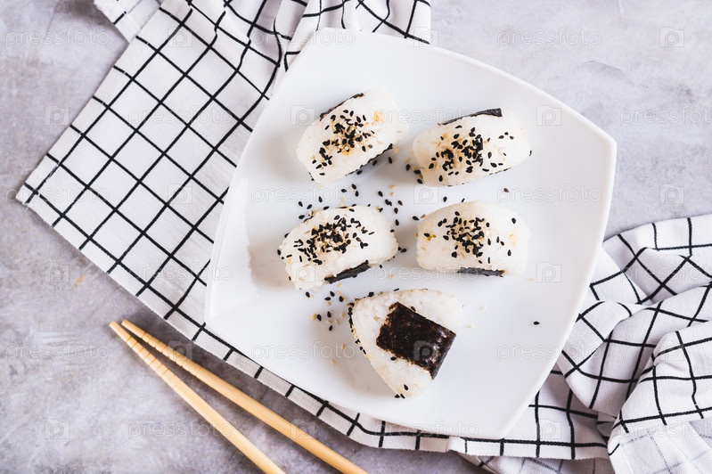 Крупным планом традиционные японские блюда Онигири из риса и тунца на тарелке на столе