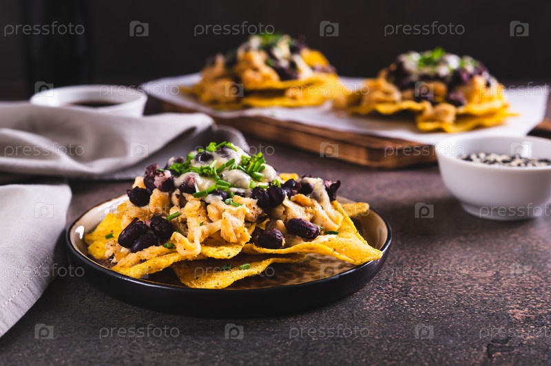Мексиканские чипсы начо, запеченные с курицей, черной фасолью и сыром на тарелке на столе