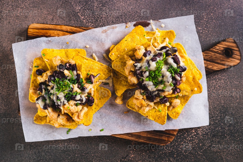 Крупным планом мексиканские запеченные начос с курицей, черной фасолью и сыром на доске сверху