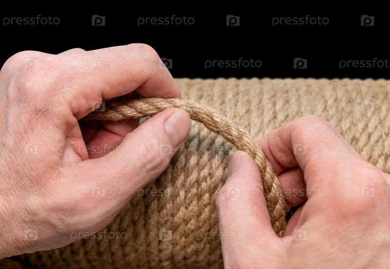 Ютовая веревка крупным планом в мужской руке на черном изоляционном фоне.Экологически чистый материал для творчества.Сделано из растения Corchorus capsularis.Когтище для кошек