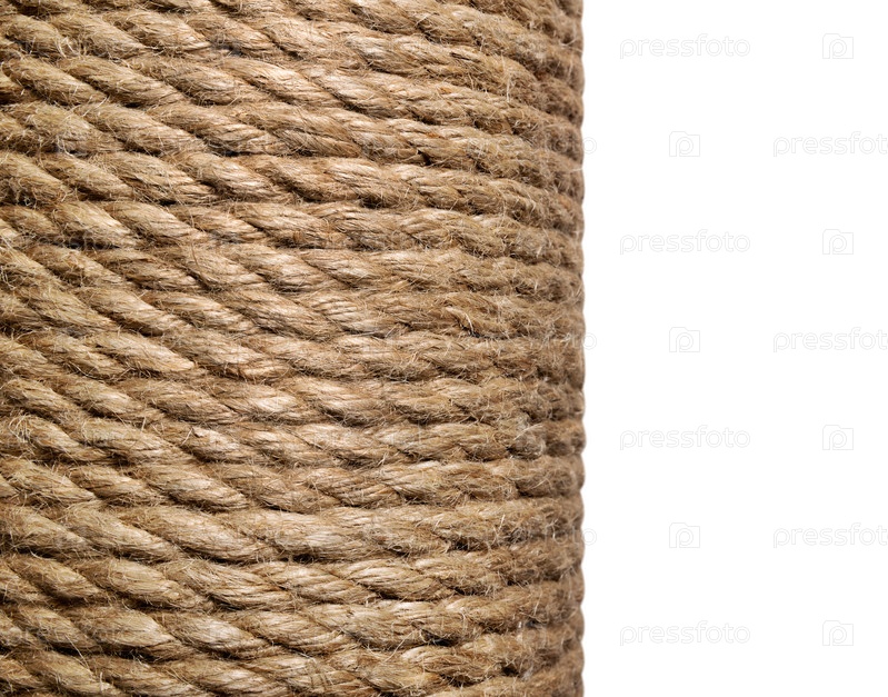 Ютовая веревка в мотке крупным планом на белом изоляционном фоне. Естественные органические нити. Экологически чистый материал для творчества. Изготовлен из растения Corchorus capsularis
