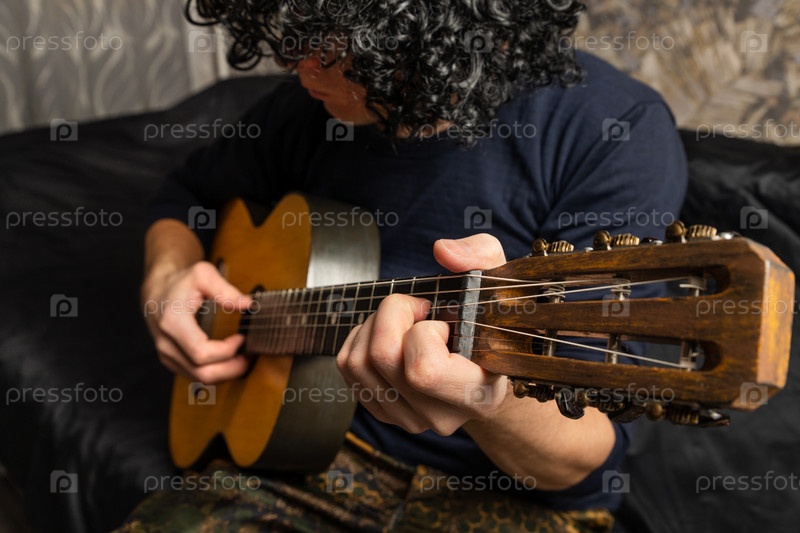 Игра на акустической гитаре. Музыкант зажимает лады гитары на грифе. Музыкальный инструмент в мужских руках. Сосредоточьтесь на переднем плане