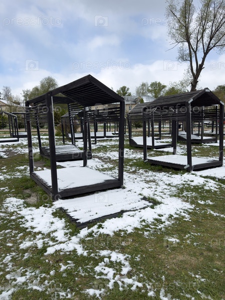 Белый снег лежит на зеленой траве