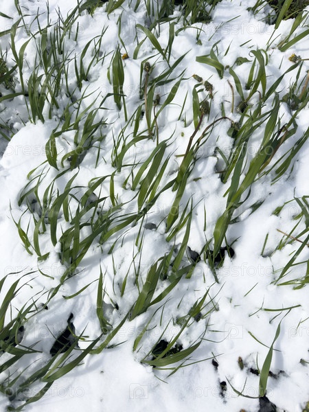 Белый снег лежит на зеленой траве