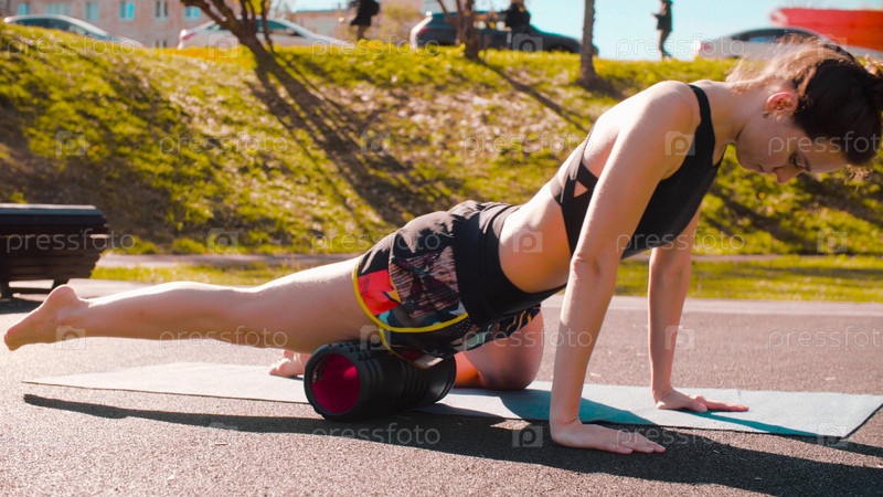 Женщина делает самомассаж ног валиком