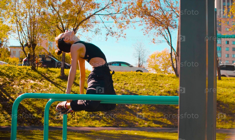 Молодая привлекательная женщина делает упражнения на параллельных брусьях