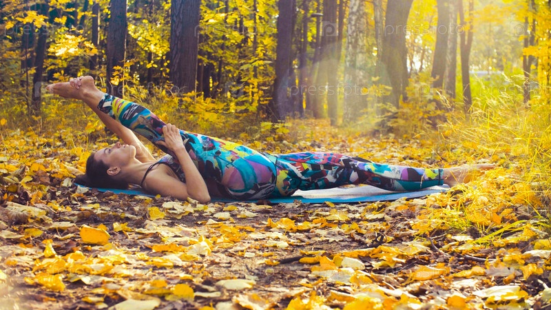 Молодая красивая женщина делает хореографические упражнения в осеннем лесу