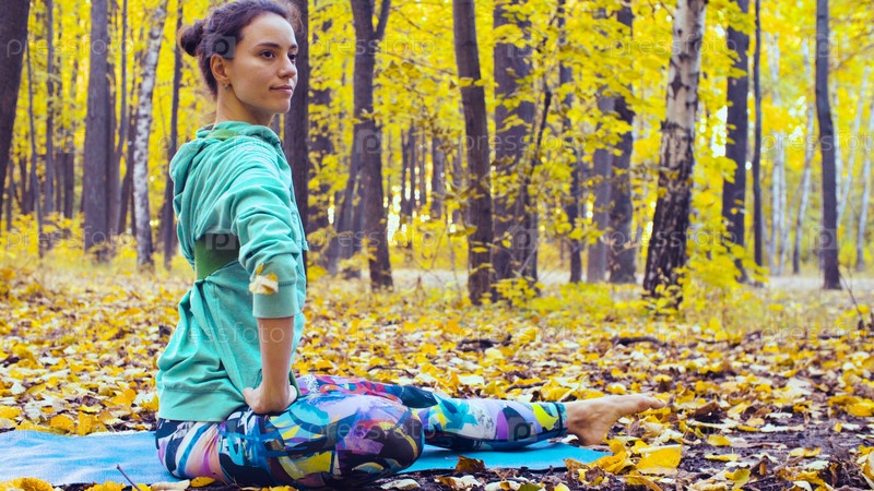 Молодая красивая женщина делает хореографические упражнения в осеннем лесу
