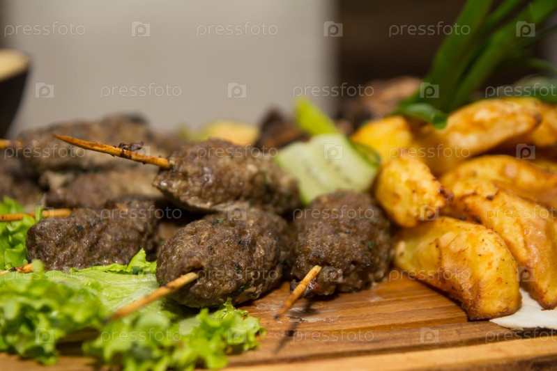 Кебаб, жареный горшок и овощи. Селективный фокус
