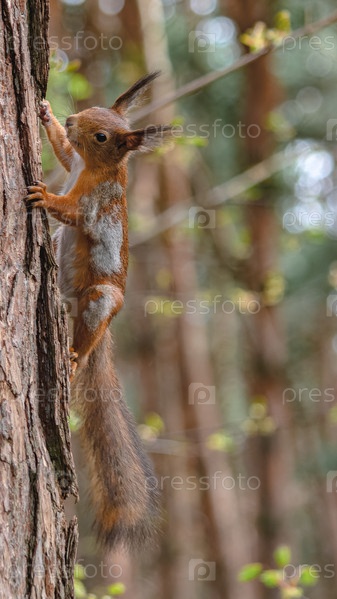 Лесная белка бегает и прыгает по деревьям в поисках еды