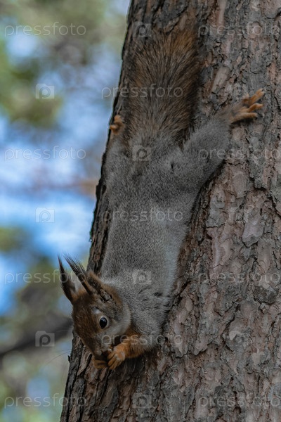 Лесная белка бегает и прыгает по деревьям в поисках еды