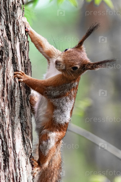 Лесная белка бегает и прыгает по деревьям в поисках еды