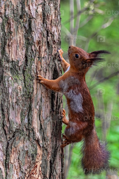 Лесная белка бегает и прыгает по деревьям в поисках еды