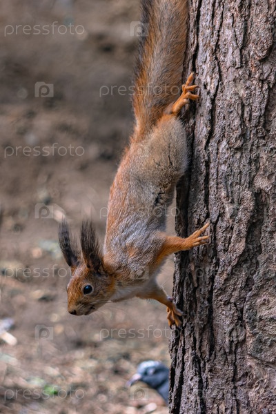 Лесная белка бегает и прыгает по деревьям в поисках еды