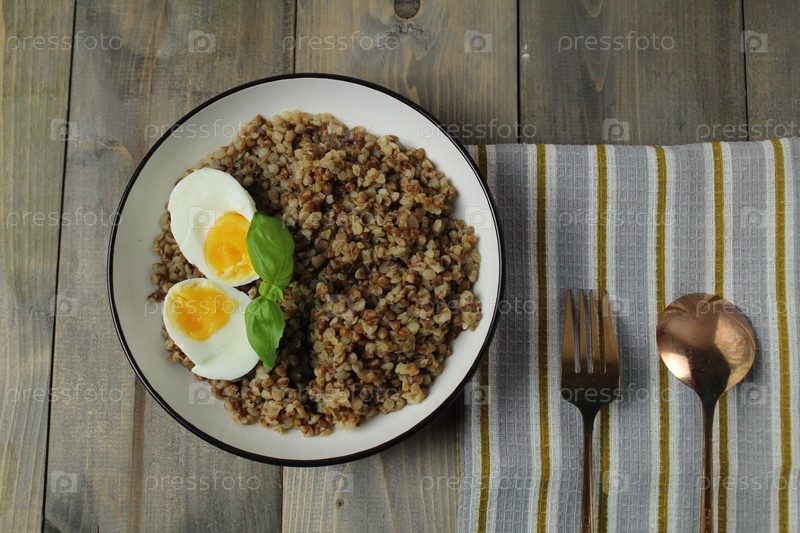 Гречка, вареное яйцо, зелень, базилик, ложка, вилка на салфетке. Вид сверху. Концепция вкусного завтрака и обеда. Славянские блюда