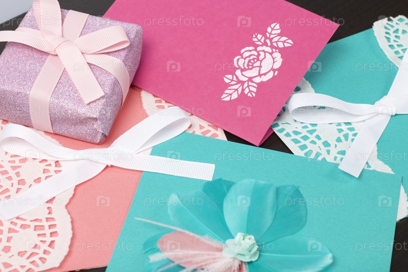 Открытки ручной работы. Рядом подарок в упаковочной бумаге, перевязанный ленточкой. Оригинальный подарок