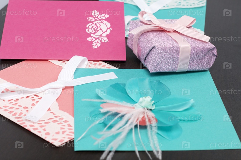 Открытки ручной работы. Рядом подарок в упаковочной бумаге, перевязанный ленточкой. Оригинальный подарок