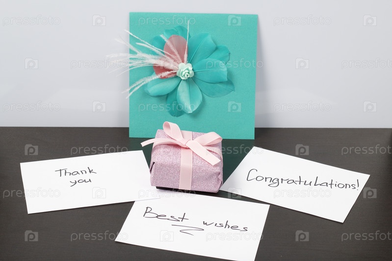 Открытки ручной работы. Рядом подарок в упаковочной бумаге, перевязанный ленточкой. Оригинальный подарок