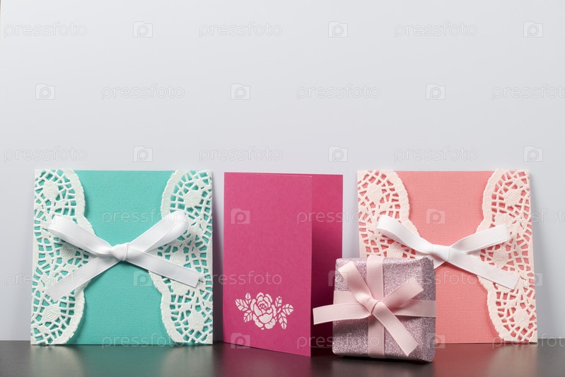 Открытки ручной работы. Рядом подарок в упаковочной бумаге, перевязанный ленточкой. Оригинальный подарок