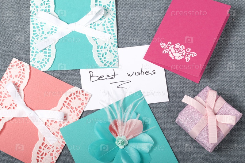 Открытки ручной работы. Рядом подарок в упаковочной бумаге, перевязанный ленточкой. Оригинальный подарок