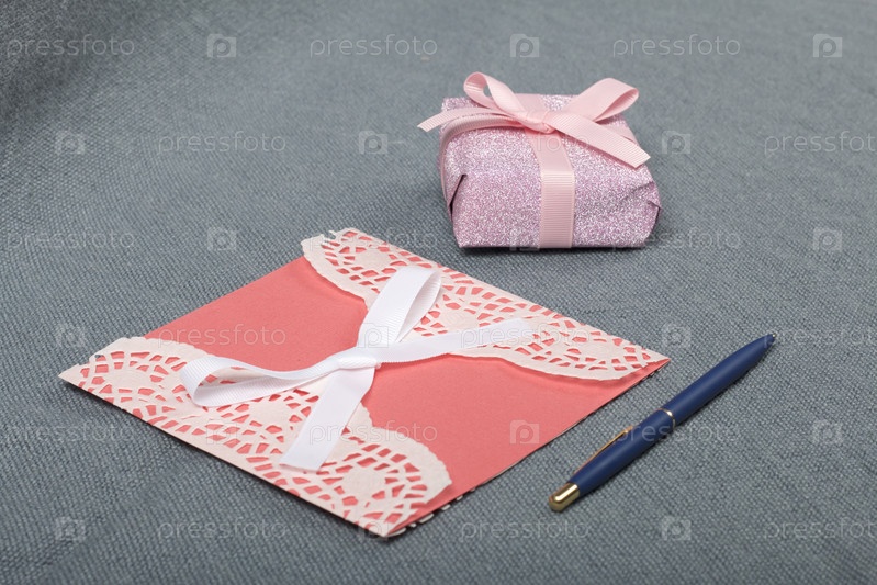 Открытка своими руками. Рядом подарок в упаковочной бумаге, перевязанный ленточкой. Оригинальный подарок