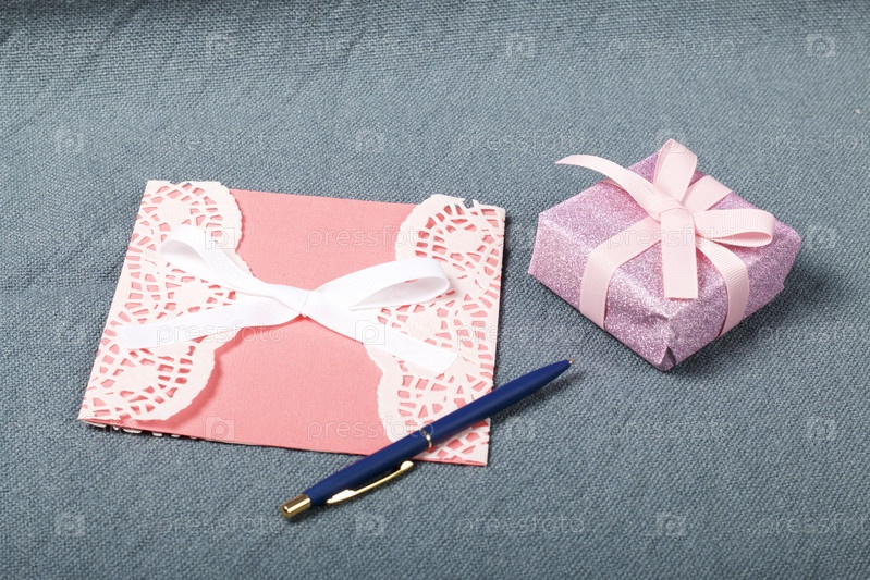 Открытка своими руками. Рядом подарок в упаковочной бумаге, перевязанный ленточкой. Оригинальный подарок