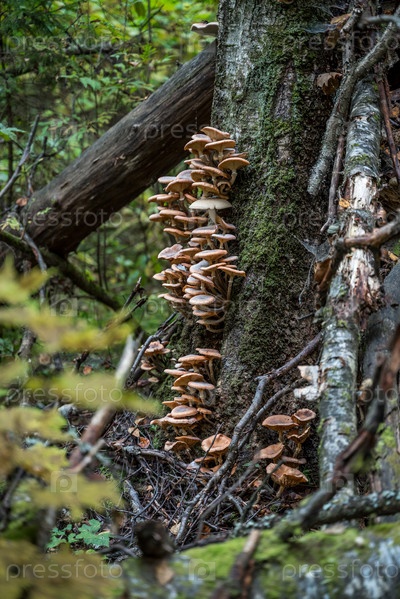 Опята растут на стволе дерева в лесу