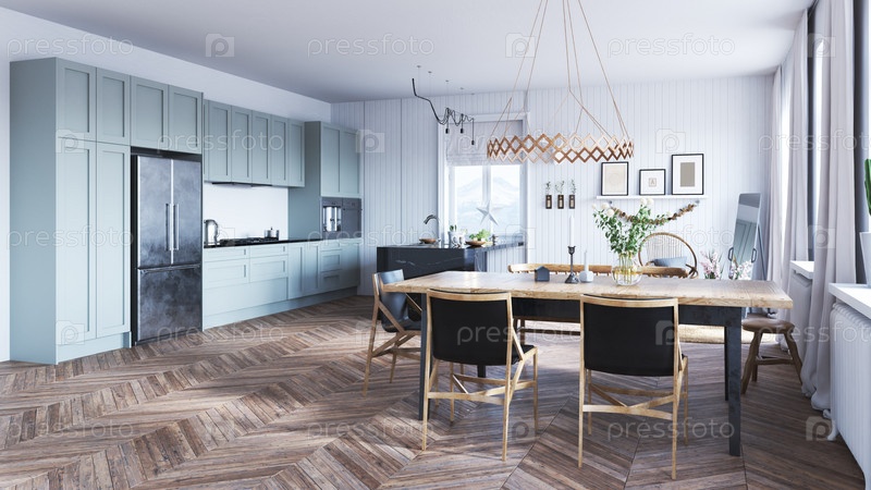 Современный дизайн интерьера кухни с обеденным столом. 3D-рендеринг