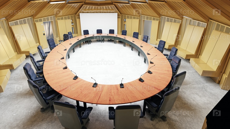 Круглый стол и стулья конференц-зала в зале с современным дизайном интерьера
