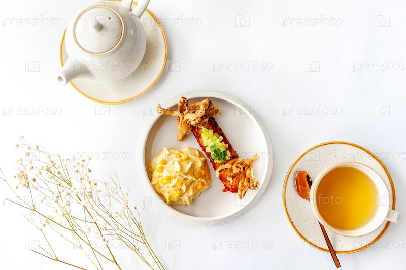 Легкий завтрак в ресторане с зеленым чаем и тыквенным пюре