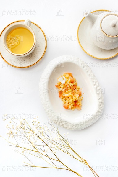 Легкий завтрак в ресторане с зеленым чаем и десертом