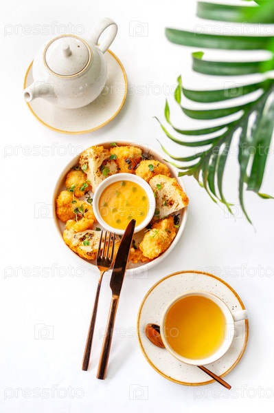 Легкий завтрак в ресторане с зеленым чаем и запеченной цветной капустой