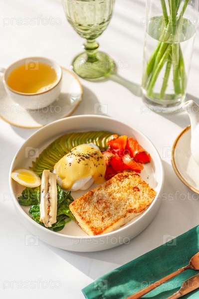 Легкий завтрак в ресторане с зеленым чаем, тостами, яйцом, авокадо и лососем