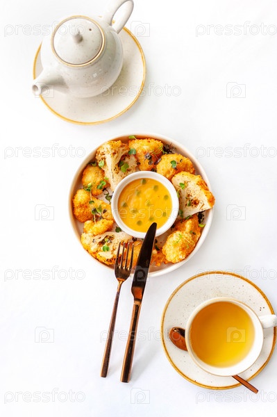 Легкий завтрак в ресторане с зеленым чаем и запеченной цветной капустой