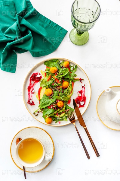 Легкий завтрак в ресторане с зеленым чаем и салатом
