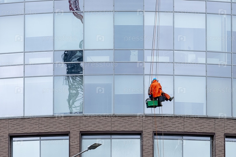 Санкт-Петербург, Россия - 10 мая 2024 года. Промышленный альпинист моет окна