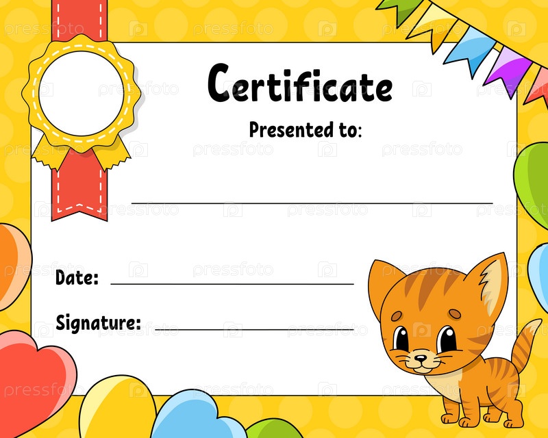 Образец сертификата для детей. Красочный диплом школы и дошкольного учреждения. С милым характером. Векторная иллюстрация