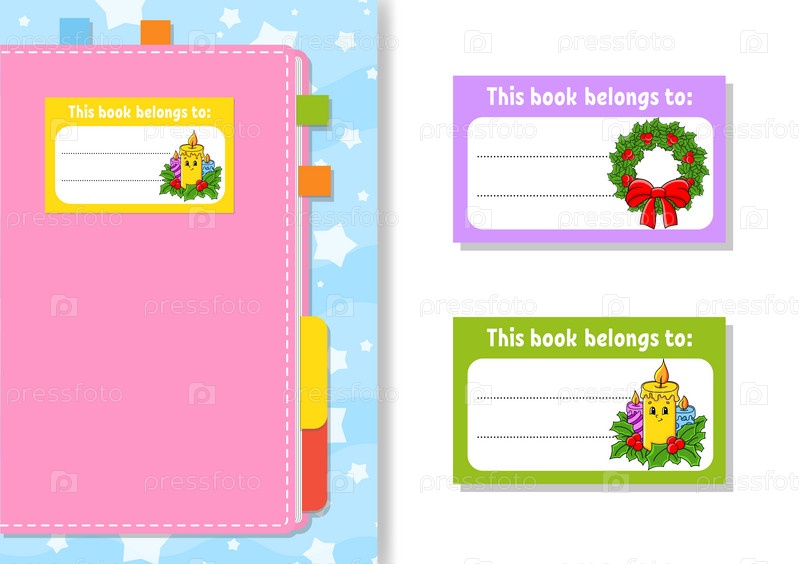 Наклейки на книги для детей. Прямоугольная форма. Мультипликационный персонаж. Для дневника, блокнота, книги. Изолированные на белом фоне. Векторная иллюстрация