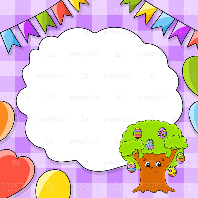 Праздничное изображение с местом для копирования текста. мультипликационный персонаж, воздушные шары, гирлянды. Для оформления поздравительных открыток, дней рождения, наклеек. Векторная иллюстрация