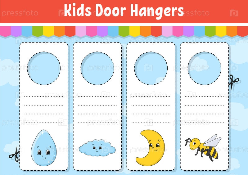Дверные вешалки. Симпатичные персонажи мультфильмов. Знак для печати. Детский стиль. На дверных ручках. Шаблон тега. Векторная иллюстрация