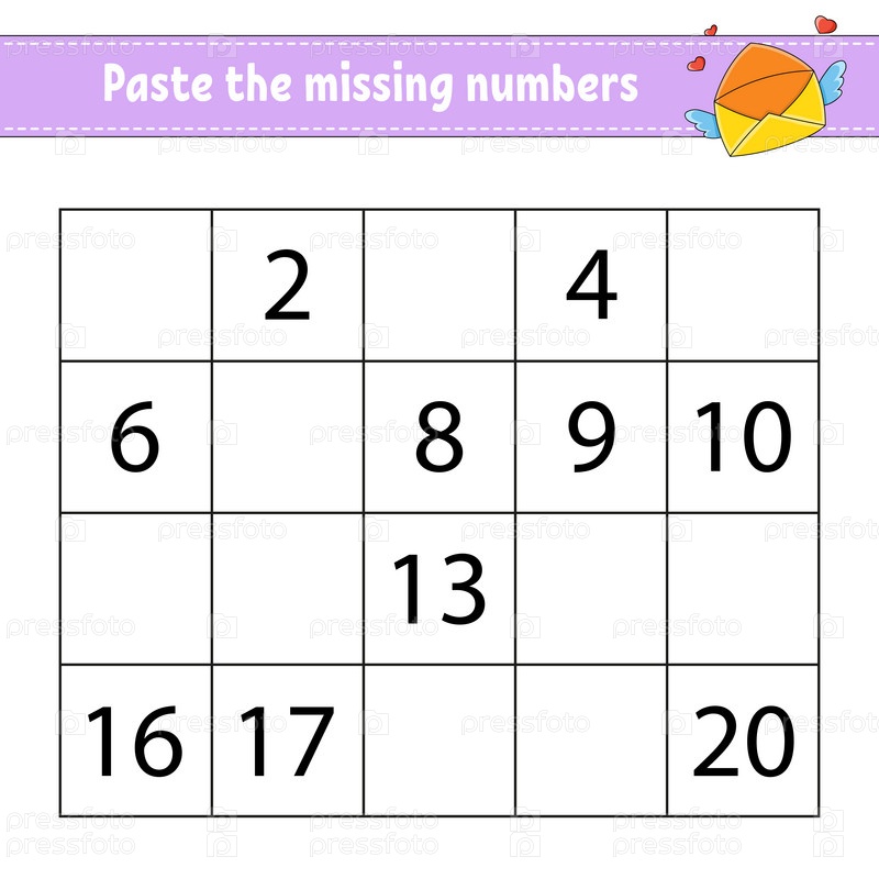 Вставьте недостающие цифры от 1 до 20. Игра для детей. Практика почерка. Изучение цифр для детей. Рабочий лист по развитию образования. Страница активности. Векторная иллюстрация