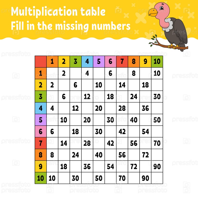 Вставьте недостающие цифры. Изучение таблицы умножения. Практика почерка. Рабочий лист по развитию образования. Цветная страница активности. Игра для детей. Векторная иллюстрация