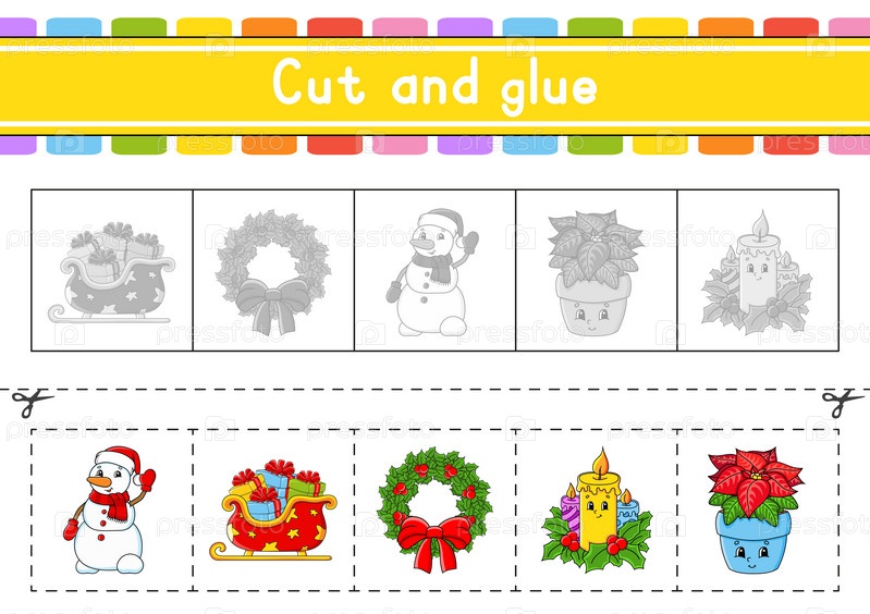 Вырежи и играй. Бумажная игра с клеем. Флэш-карты. Рабочий лист по образованию. Страница активности. Практика с ножницами. Векторная иллюстрация