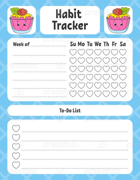 Трекер привычек для детей. Шаблон листа для печати. С милым характером. Векторная иллюстрация