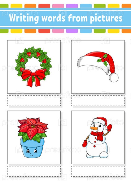 Написание слов по картинкам. Выучите английские слова. Рабочий лист по развитию образования. Цветная страница активности. мультипликационный персонаж. Векторная иллюстрация
